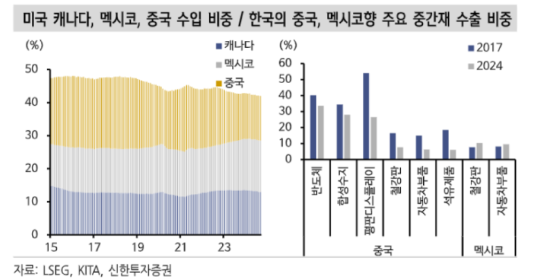 지리적으로 캐나다와 멕시코 사이에 위치한 미국은 각국으로 부터 중간 생산물을 공급받 위치에 있습니다. 미국에 원자재 및 중간 생산물을 공급하는 역할을 하는 멕시코와 캐나다의 입장에서는 본인들이 공급하는 물건에 25%라는 관세는 결코 가볍게 볼 수 있는 문제가 아닙니다.