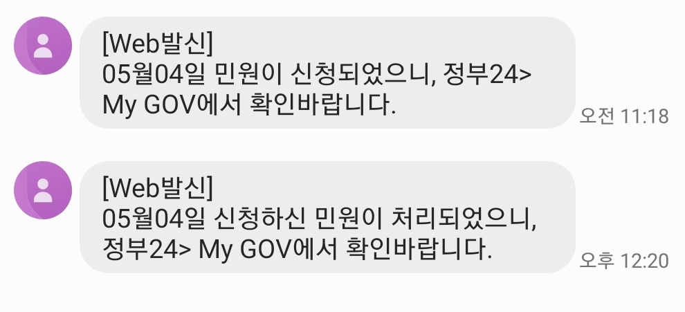 6. 저는 지난 5월4일에 신청을 했는데요. 아래 문자 알림 보시면 11시 18분에 신청 완료된 건이 12시 20분에 완료 되었네요. 1시간 내외로 걸렸네요.