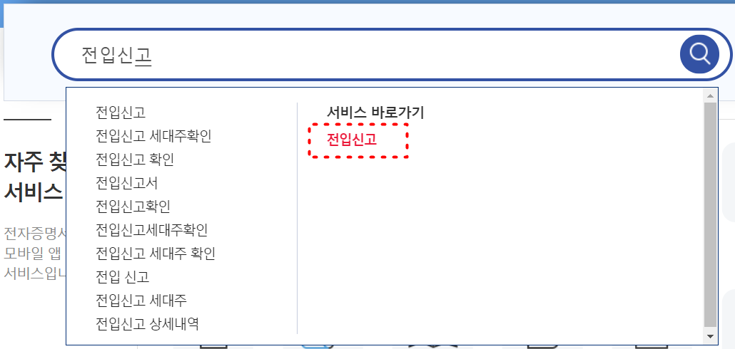 2. 홈페이지 검색창에 "전입신고"를 검색해 주세요. 참! 공인인증서는 해당 홈페이지 회원이던 비회원이던 간에 전입신고를 하려면 꼭 필요하니 사전에 준비해 주세요.