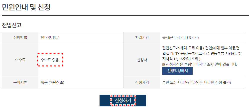 3. 전입신고를 신청하면 아래와 같이 간단한 안내가 나오네요. 수수료도 없구요.