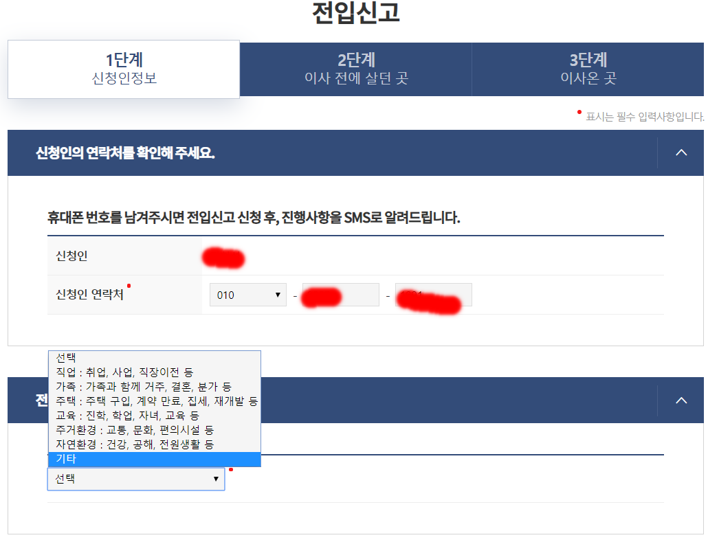 5. 그럼 이제 본격적으로 전입신고 하게 되는데요. 총 3단계로 나누어져 있는데 각 항목에 맞게 정보를 입력하시면 끝!!