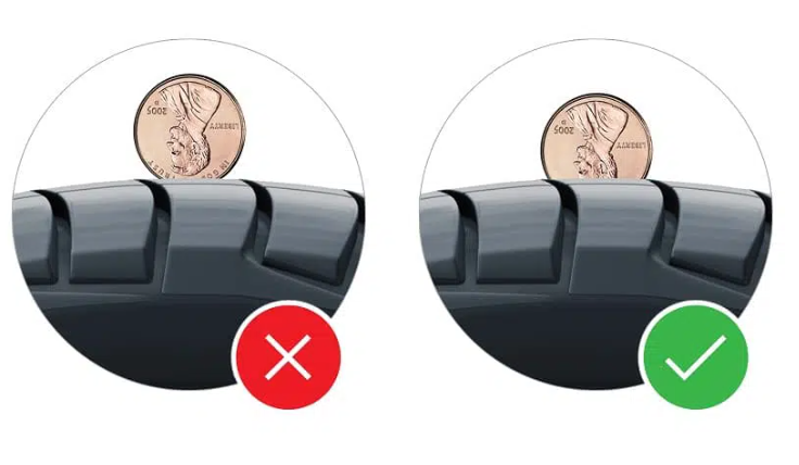 현재 타이어 마모 상태를 체크하기 위해서는 100원짜리 동전 하나면 충분합니다. 타이어 트래드에 100원짜리를 넣어보고 옆에서 봤을 때, 이순신 장군의 감투가 보인다면 타이어를 교체해 주셔야 안전합니다.