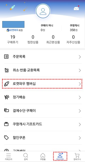 1. 쿠팡어플을 실행시켜 로그인하시고, 화면 아랫 부분에 마이쿠팡 --> 로켓와우 멤버십으로 들어갑니다.