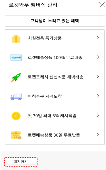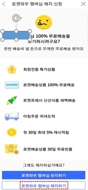 3. 그럼 아래 화면과 같이 또 물어봅니다 ㅎ... 로켓와우 멤버십 해지하기 터치!