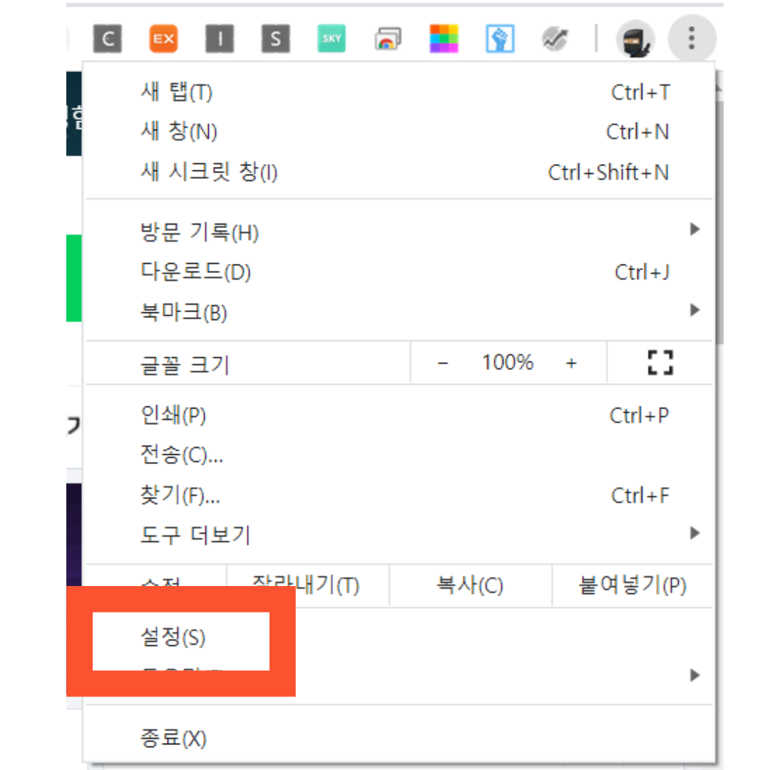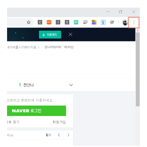 1. 크롬브라우저를 실행하고, 우측 상단에 세로로 점3개 있는 버튼을 클릭해 주세요