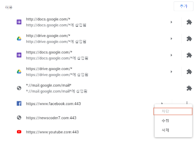 5. 화면 아랫부분쪽에 허용이라는 부분에 여러가지 사이트가 연결된 것을 볼 수 있는데 세로점 3개 를 클릭하셔서 차단를 눌러 주세요