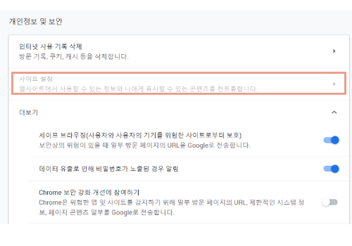 3. 설정 화면에서 아래 화면과 같이 "개인정보 및 보안" --> "사이트설정"을 눌러 주세요