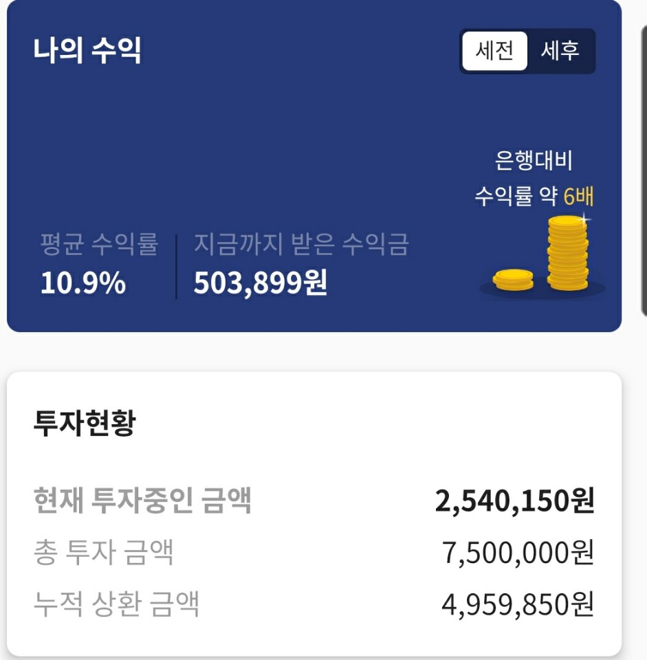 최초 500만원 투자해서 상환이되면 지급받은 이자 + 원금을 재투자 해서 복리 효과를 꾀 하였습니다. 위 내역을 보시면 상당히 해 볼만한, 아니 안하면 바보인 투자처임에 틀림 없습니다.